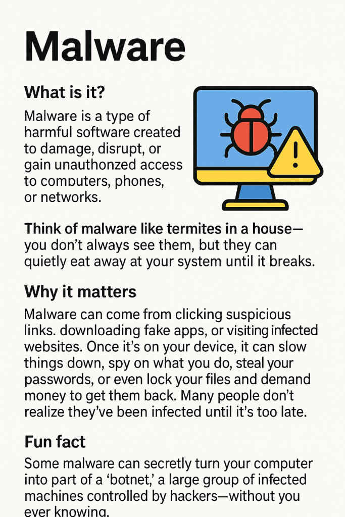 Malware is bad software that sneaks onto your device to spy on you, break things, or steal your information.